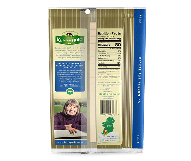 With its mellow flavor, hint of butter, faint zing, light touch of salt and semi-firm texture, Kerrygold Savory Cheddar hits all the right notes. This easy-to-love cheddar comes pre-sliced in resealable packaging. Extremely snackable, it’s guaranteed to brighten up any lunchbox.
