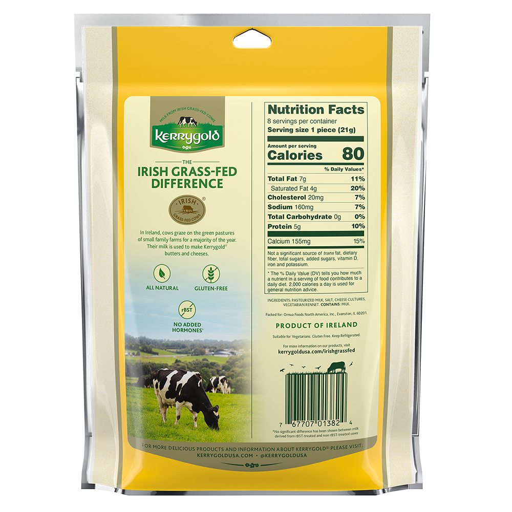 Dubliner® is a robust aged cow’s milk cheese with a bit of a hard texture similar to a Cheddar. In one bite you can taste the diversity of flavors – from nutty to sharp to sweet – that can only come from a natural cheese made from the milk of grass-fed cows. What might seem ambiguous is actually a well-balanced mix of cheese cultures and naturally occurring amino acids. This diversity pays off in its ability to be served alongside a full-bodied wine like Cabernet, a freshly pulled pint of Guinness, or simply melted between a few slices of crusty brown bread.