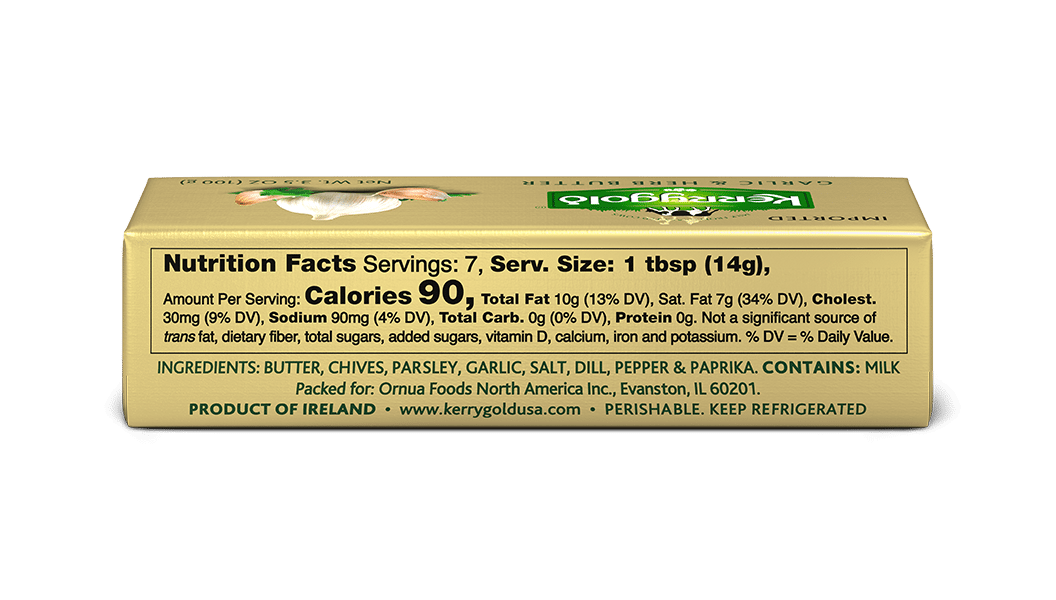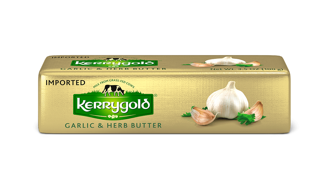 Kerrygold Garlic and Herb Butter is made with our all-natural Irish butter and a compound mixture of chives, parsley, garlic, fresh herbs and spices. It still has the creamy texture you’d expect from butter made from the milk of cows fed from the grass of Ireland’s lush pastures, but it carries a little kick with it. This specialty Irish butter is completely free of any unnatural preservatives and can bring to life a plate of steamed vegetables, grilled seafood, or add a gourmet touch to a charbroiled steak.